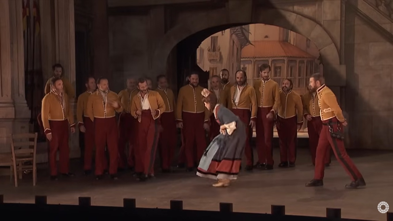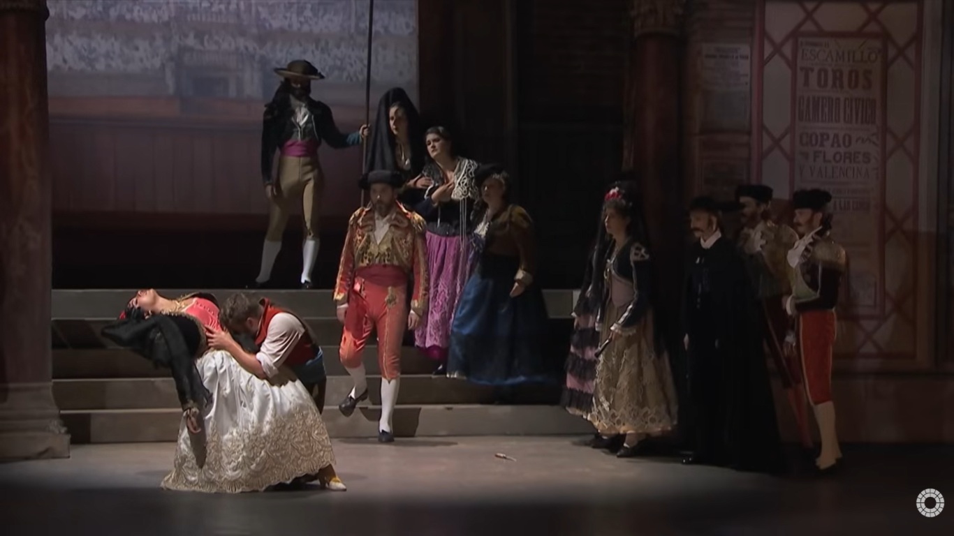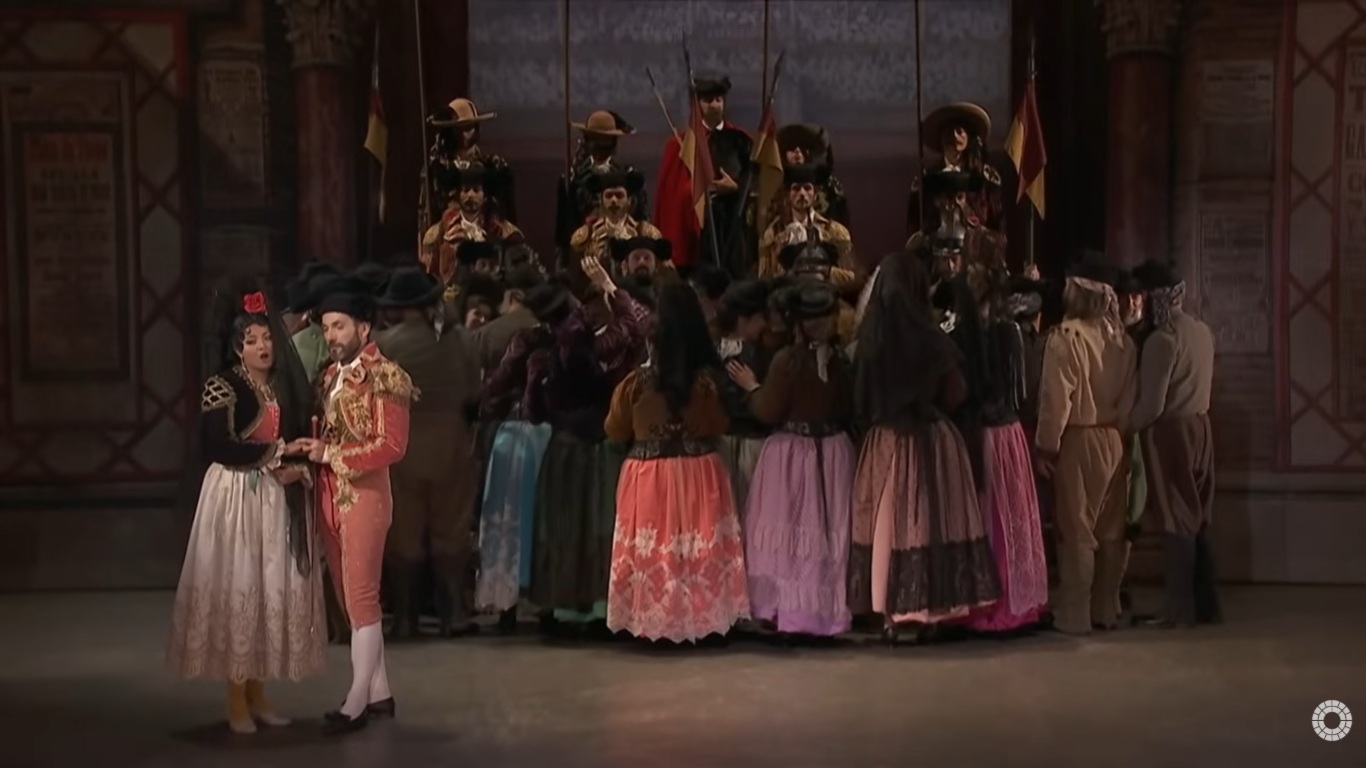 卡門係根據法國小說家Prosper Merimee所寫的同名小說改編而成的一齣四幕歌劇,於西元1875年3月3日於巴黎首演.以下配合劇情的劇照是青蛙老師從法國Palazzo bru zane centre de musique romantique francaise網站https://operavision.eu/performance/carmen-4截圖,版權歸於該網站.