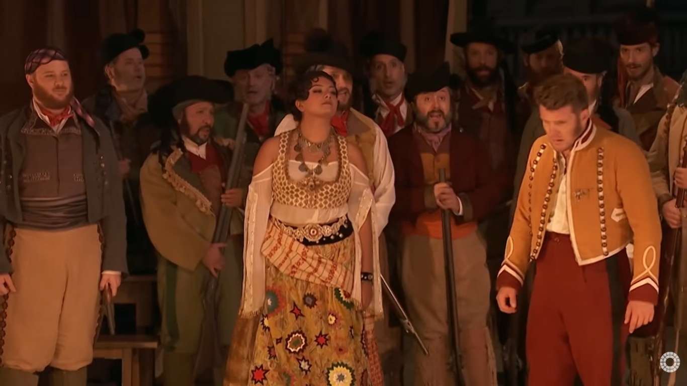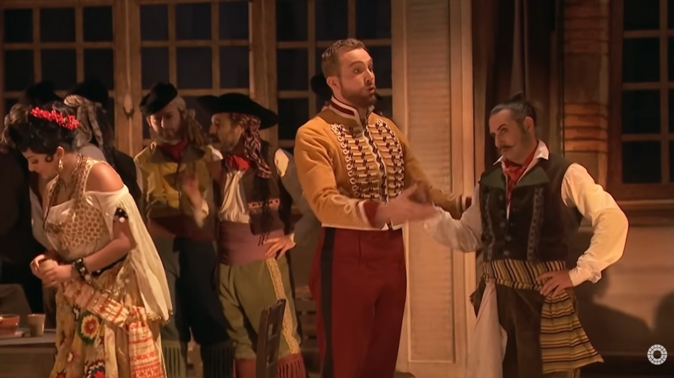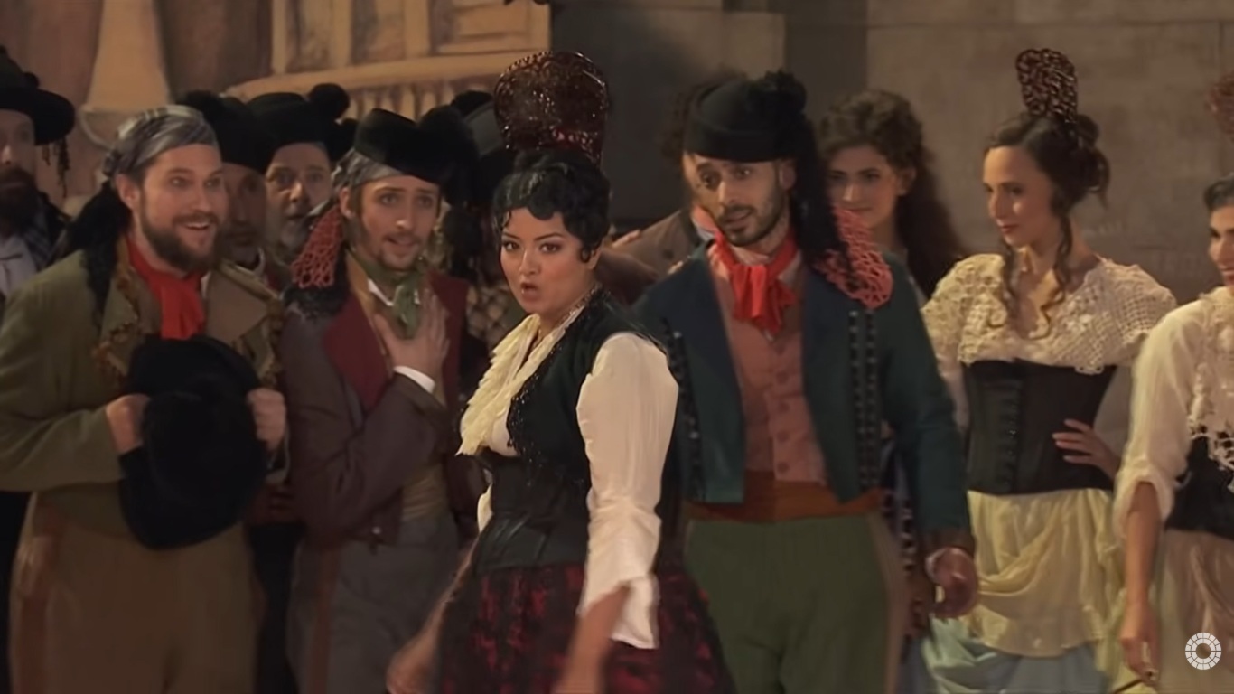 卡門係根據法國小說家Prosper Merimee所寫的同名小說改編而成的一齣四幕歌劇,於西元1875年3月3日於巴黎首演.以下配合劇情的劇照是青蛙老師從法國Palazzo bru zane centre de musique romantique francaise網站https://operavision.eu/performance/carmen-4截圖,版權歸於該網站.