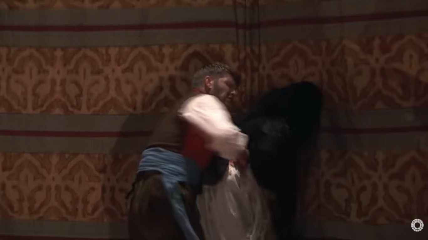 米凱拉走後,煙草工廠發生了鬥毆,荷西抓住了卡門,當時卡門拿著小刀要威脅一名女工,卡門被荷西看管著.
