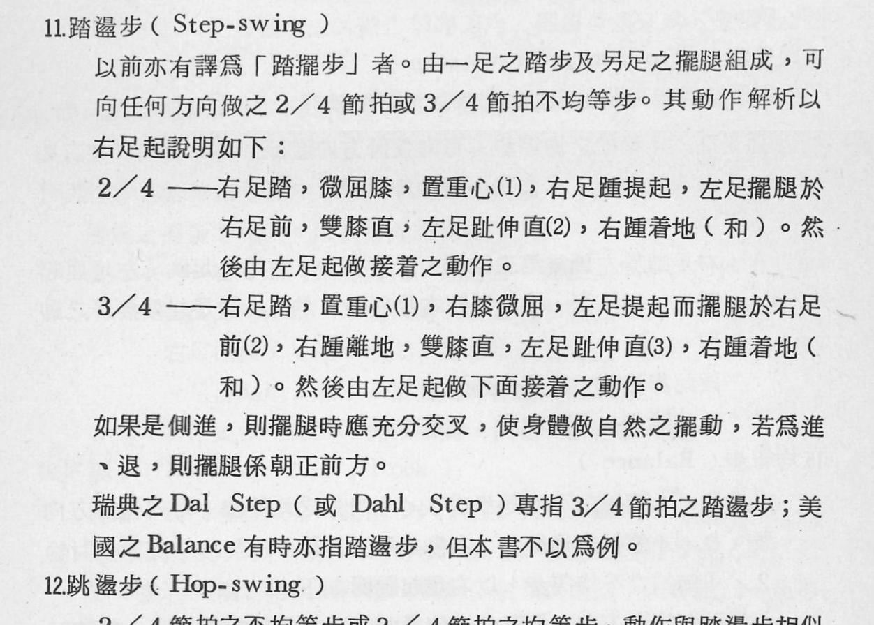 看完Step-Swing,也就是踏盪步的舞步說明之後,我們可以發現到,一般初學者,甚至某部份教舞者都忽略掉第2拍的提踵,與踵著地,也就是Swing(盪)的部份,身體重心跟著腳踵提放而隨之自然擺盪.少了這個動作,就變成踏踢步,踏擺步,而不是踏盪步,這首舞悠閒與優雅的氣氛也不見了.