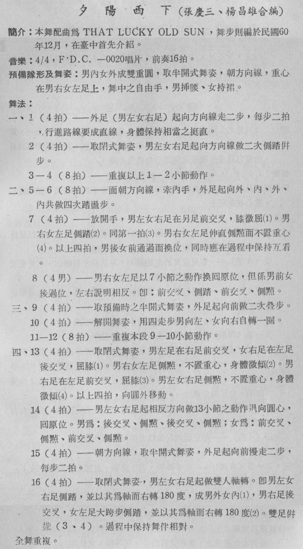 這一首令人懷念的老歌與老舞想必讓資深舞友們一下墜入時光隧道,回到當年輕青澀的歲月.這一首舞是由張慶三老師與楊昌雄老師合編,於民國60年12月發表.青蛙老師學這一首舞的時候還是在讀高中的竹光頭呢(老一輩的人才有可能聽過竹光頭這個對竹中人的戲謔稱號