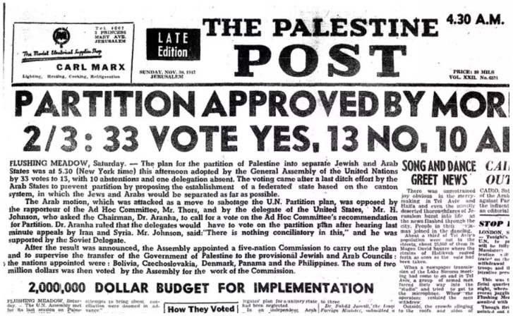 西元1947年11月30日的報紙,報導11/29日聯合國以33:13票,通過巴勒斯坦分治案: