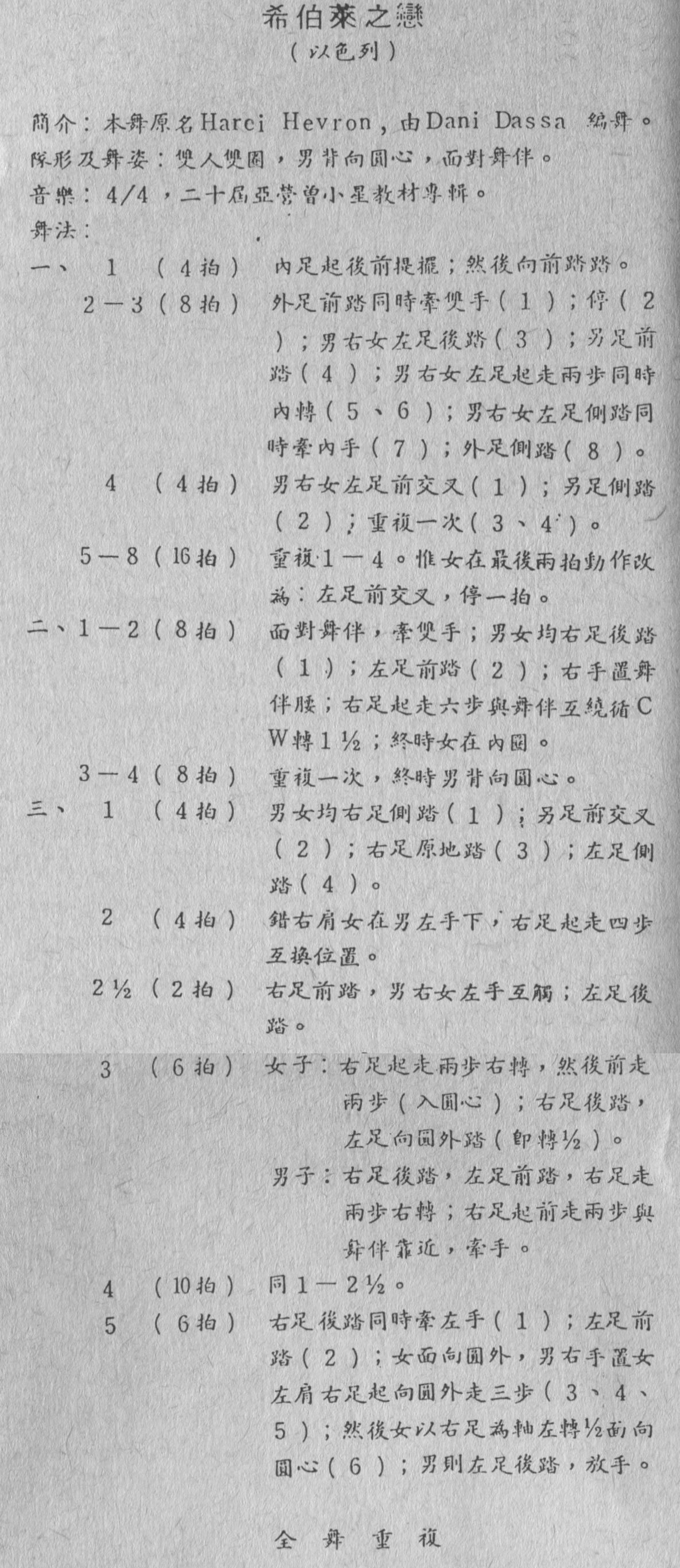 本舞的舞名與歌名是不一樣的,舞名直譯為”希伯隆山”,由故事的發生地希伯隆山來看,如果中文舞名是依照舞名音譯的話,那就翻譯有誤差了,至少應該翻譯為”希伯隆之戀”發音比較接近.如果依國家民族大愛來看,將中文舞名翻譯成希伯萊之戀反而更切題,但這裡的戀是對國家民族的大愛,不是男女之間的個人小愛.舞友們只要記得本舞故事的發生地是希伯隆山,不是希伯萊山就好(沒有希伯萊山這個山哦.
