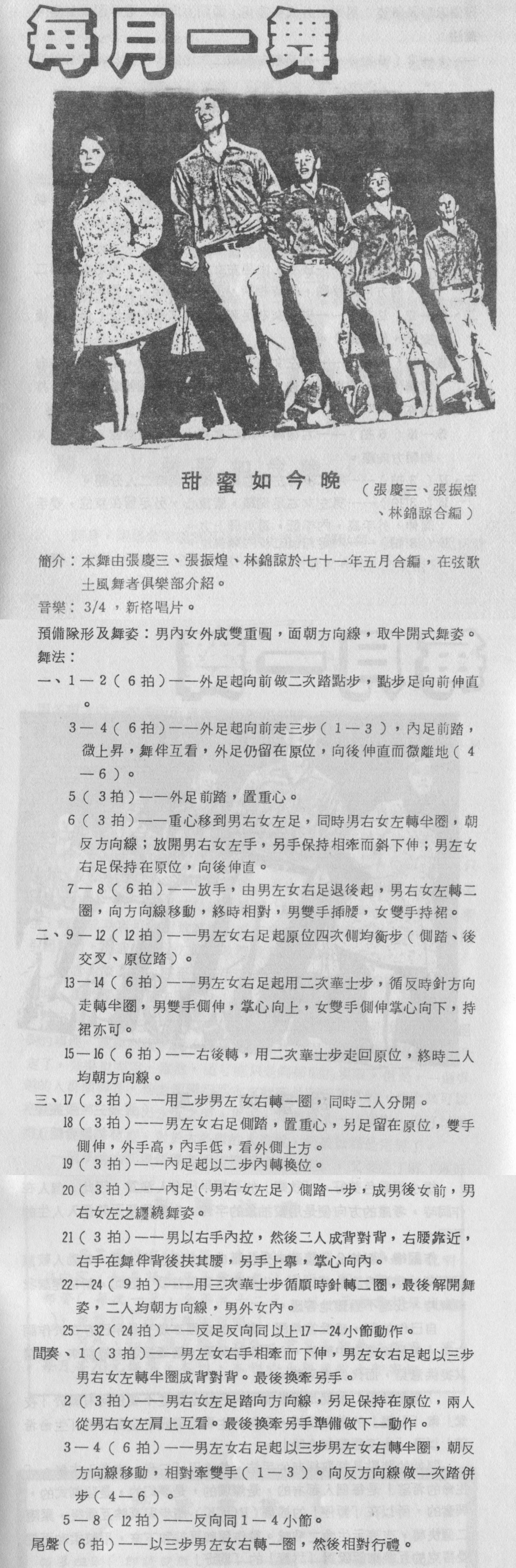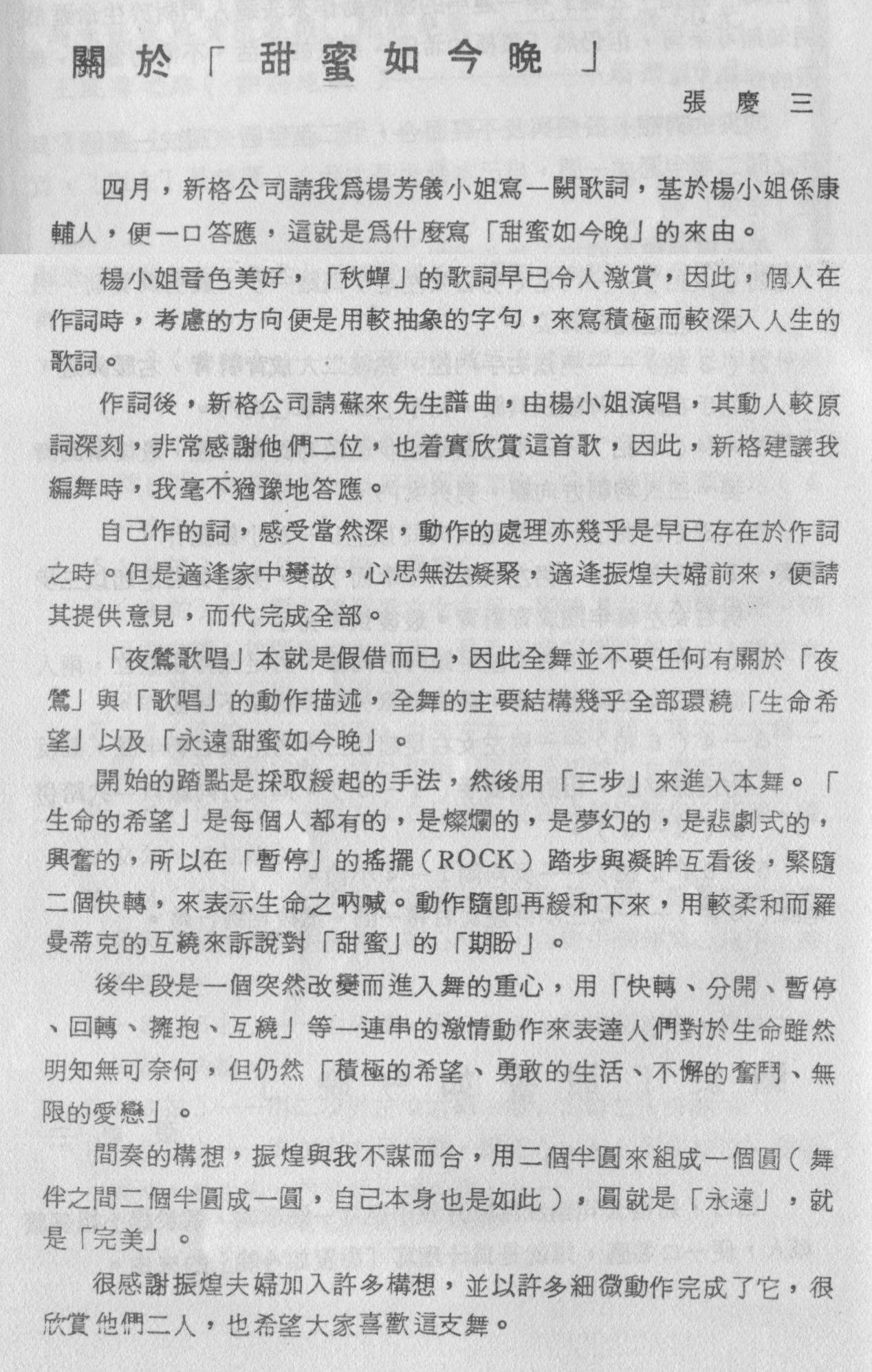 張老師編舞功力是一流的,這是眾所皆知,那麼作詞的功力呢?那更是毋庸置疑的.想當年張老師還是建中的才子呢.師母陳芳枝老師在"張慶三的土風舞世界"文章中就曾經提到張慶三老師在建中時期"作夢、寫文章、寫詩和打籃球,是當時的最愛".我們可以從張老師寫的幾首歌,例如:夜玫瑰,蘋果花,........和這首甜蜜如今晚,就看得出來張老師文學造詣與才華洋溢,誰會猜得到張老師跟我一樣是讀硬梆梆的物理系畢業的呢? ![]()