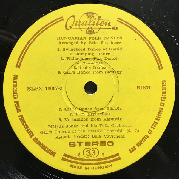 現在青蛙老師就來揭曉我們土風舞版使用的音樂.我們土風舞版使用的音樂是西元1969年1月28日,由匈牙利Béla Vavrinecz指揮,Mátyás Jónás and his Folk Orchestra樂團演出發行的”Ugorjunk a táncba... Hungarian Folk Dances”專輯唱片.這一張唱片A面總共有我們土風舞原曲3首,分別是A1:卡那村的牧人;A4:中歐少女跟A6的這一首蘇穆基女郎.