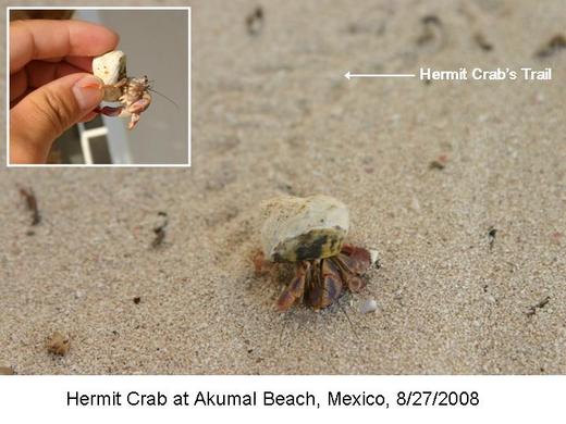 是的,答案就是寄居蟹(Hermit Crab)。那些密密麻麻、相互交錯的沙灘軌跡就是很多、很多的寄居蟹在月夜的沙灘上漫步一整夜所印出的足跡圖。上圖是我白天在洗腳台上發現的Hermit Crab在沙灘上的照片--請注意它身殼後的軌跡。當然,照完相片之後,我就把那隻寄居蟹放置於陰暗處,然後在當天晚上將它放回沙灘。