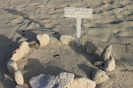 母海龜只會在夜間爬上岸來產卵,因為爬行的軌跡太明顯了,不用叫人每天掃沙灘,Darlene跟Elio也能在清晨沙灘漫步時就知道昨夜是否有海龜上岸來下蛋。如果有的話,Darlene跟Elio會用石頭將產卵處圈起來,然後插上牌子,上面用英文及西班牙文寫著「海龜下蛋處,不要碰。」(Turtle nest. Don't touch.)清晨掃沙灘的人的照片的右下角就是一個產卵石頭圈,近看如下圖。下次再來談小海龜,讓我感動的小海龜生死搏鬥的故事。
