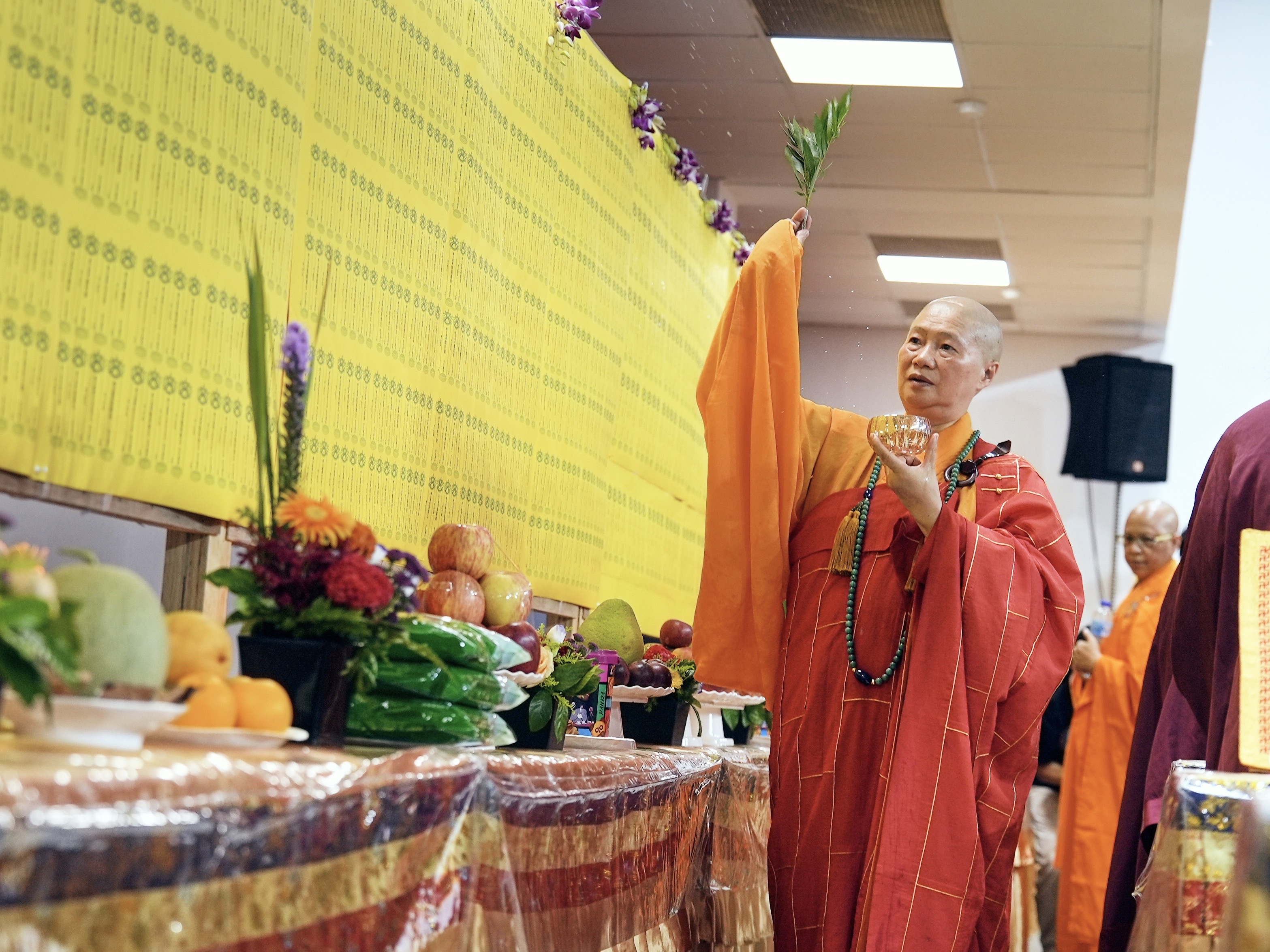 聖德 釋證達教尊主法孝親報恩法會,進行往生超薦牌位加持灑淨,場面肅穆吉祥。