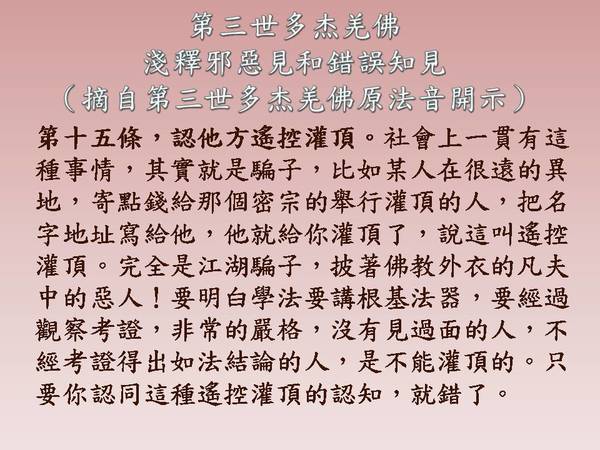 第三世多杰羌佛 淺釋邪惡見和錯誤知見--錯誤知見--第十五條,認他方遙控灌頂