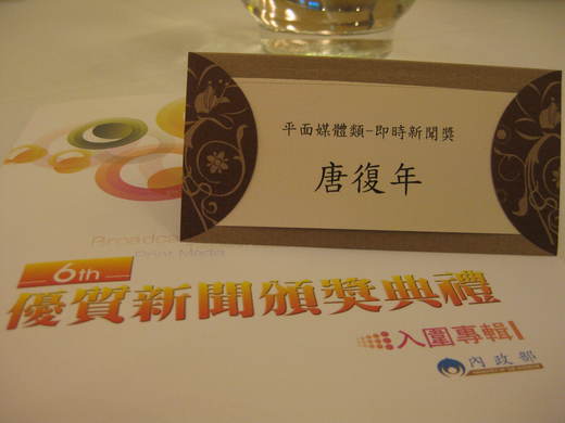 十二月九日下午來到台北假日花園飯店,內政部舉辦的優質新聞報導獎頒獎典禮,雖沒有得獎,但能和同時進報社、現在天天一起作戰的黃寅,美女學妹念慈以及U種子超優女弟子慧瑛度過一個歡樂的下午,的確很開心。當然兩位像朋友一樣的長官劉副和周副,也是讓我們一路開心的重要原因喔!