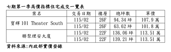 根據最新內政部實價登錄顯示,位於市政北二路與河南路口的**「寶輝101 Theater South」展現強大創價能力,26樓戶別於115年2月分別以每坪107.9萬元及101.8萬元成交**,其中單價107.9萬元的交易案更刷新了該社區的新高紀錄。該案延續寶輝國際團隊血統,並由日本前五大營造公司「日商大林組」打造,在市場冷靜期依然表現亮眼。