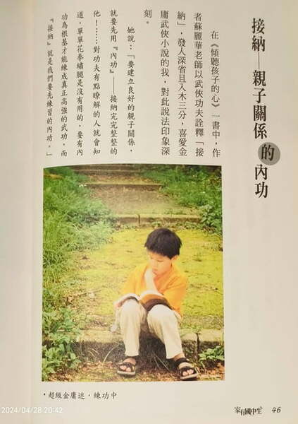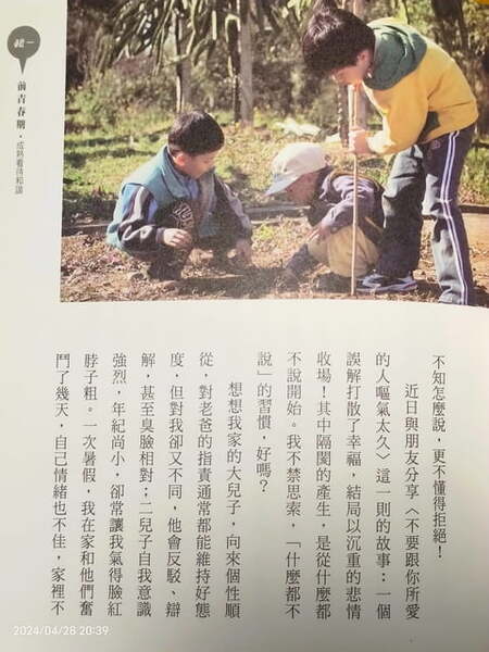 書中也提到大人無須自己先預設立場,擔憂還沒發生的事,越是擔憂的事就越會發生,內心一直想的事就好像「心願」一樣,不實現也難!總是擔心孩子偏離了什麼!看到這一段不禁讓我笑了!成年人的我們就是常常杞人憂天,沒事瞎操心,自己嚇自己!一枝草一點露,每個人都有他們該走的路!強迫孩子走自己鋪好的路,讓他們錯失嘗試與探索,豈不可惜?!