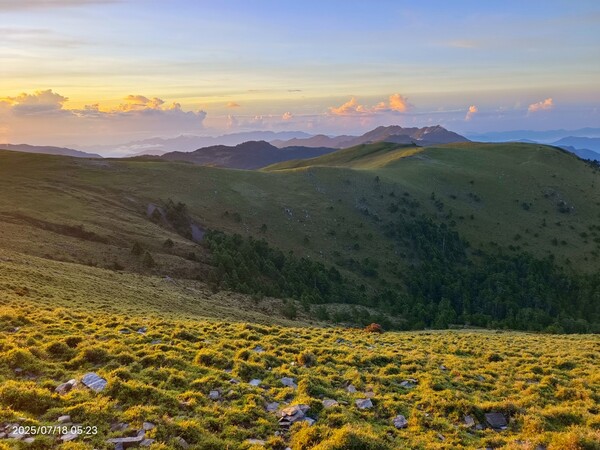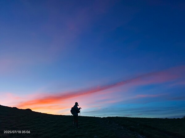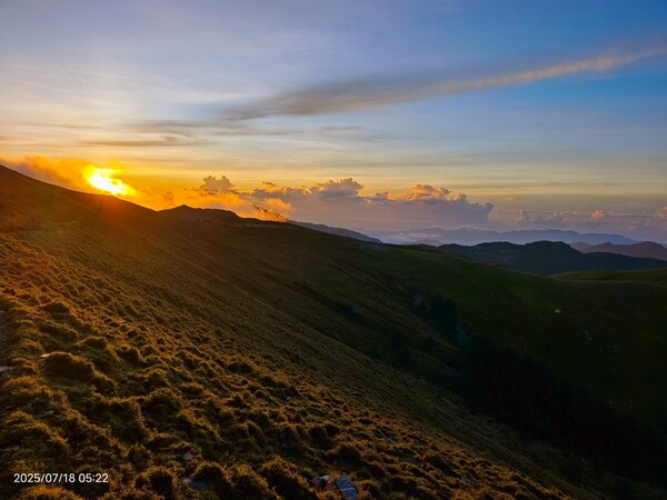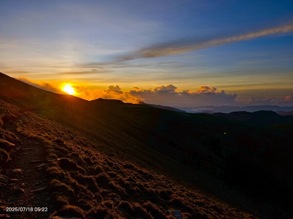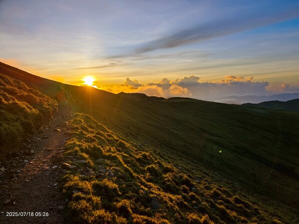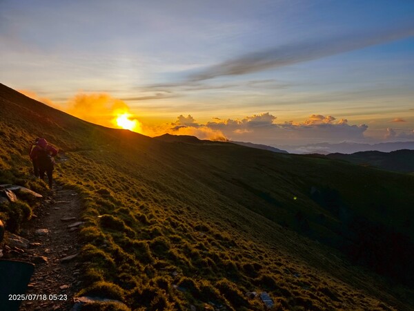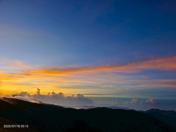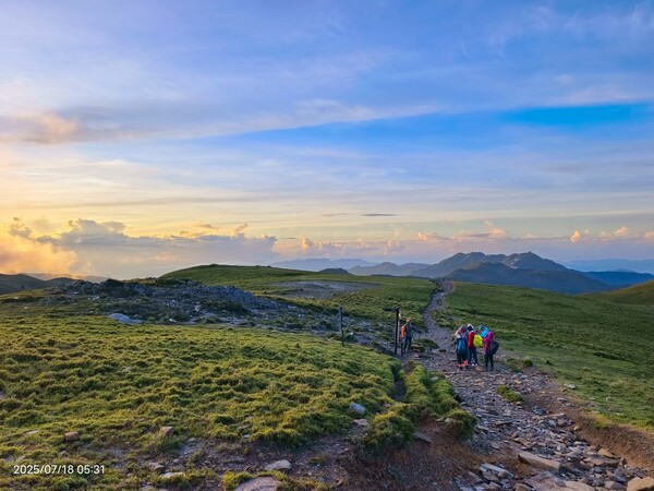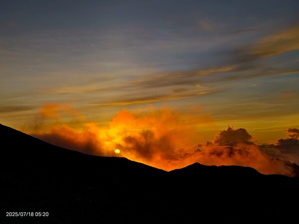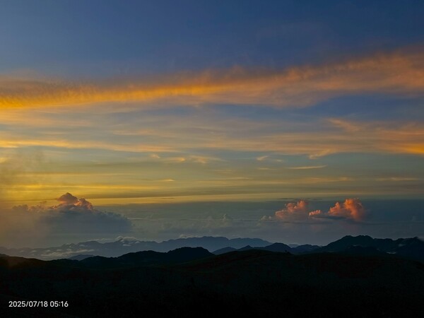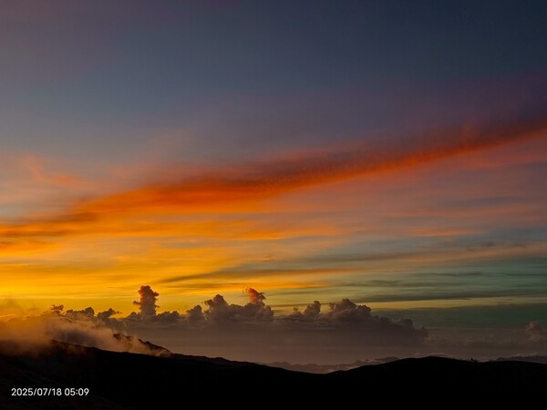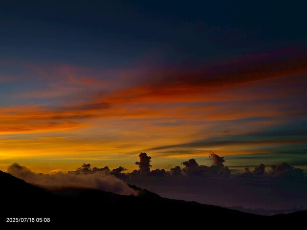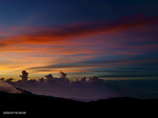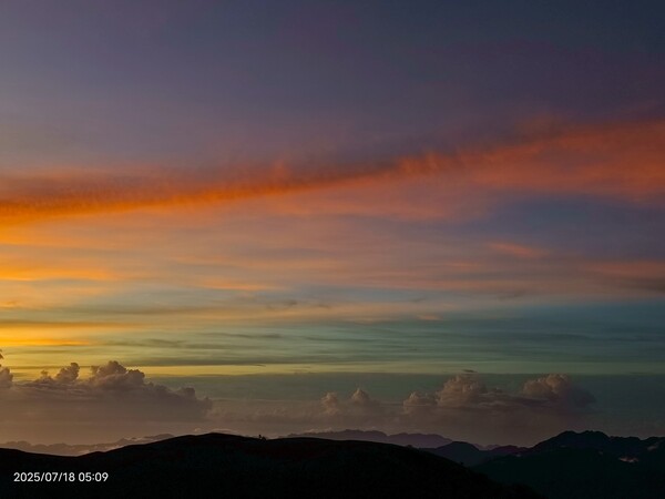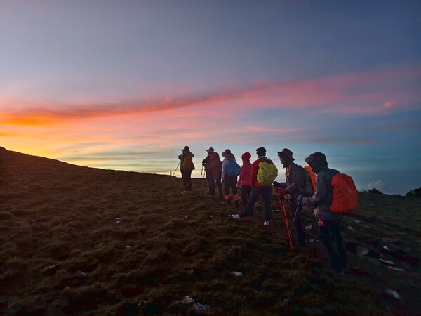 上上下下,摸黑跋涉兩小時,忽見天邊一片絢麗霞光,雲影奇特充滿想像與故事,教人讚嘆連連,每個人歡呼大喊:真是美極了!不過,好景稍縱即逝,變化須臾之間,短短數分鐘即消逝不見,卻深印在心中。
