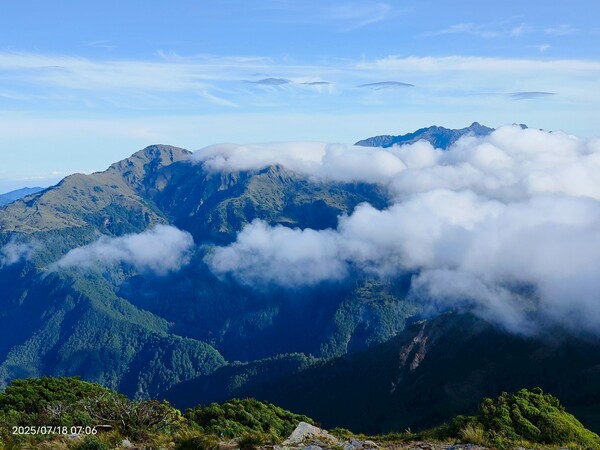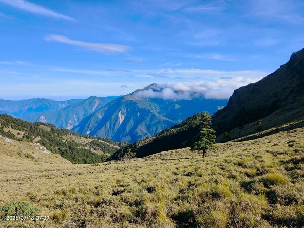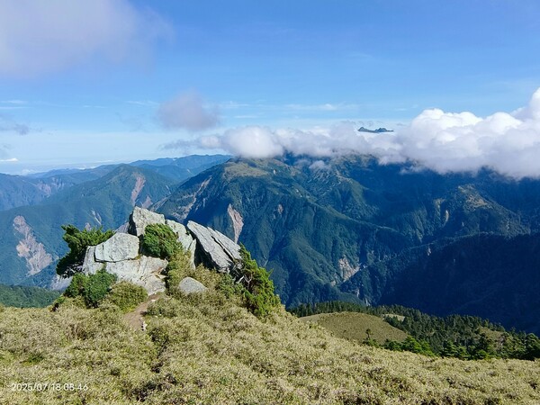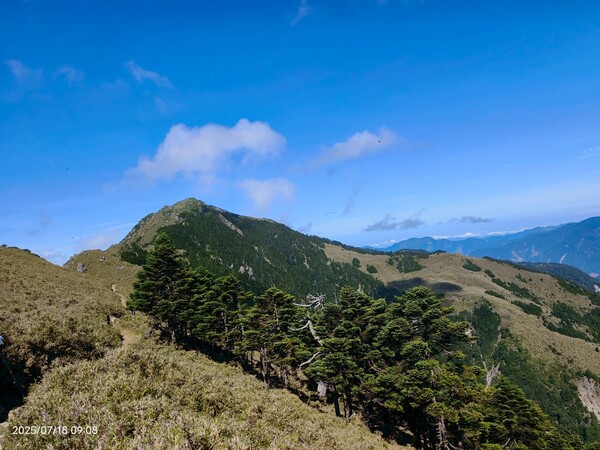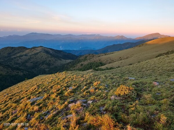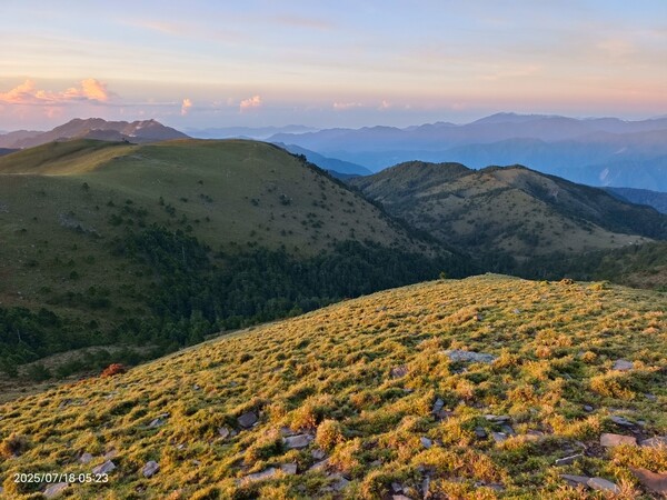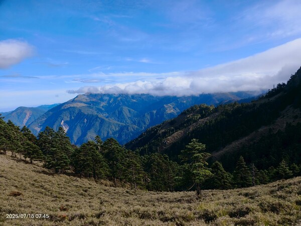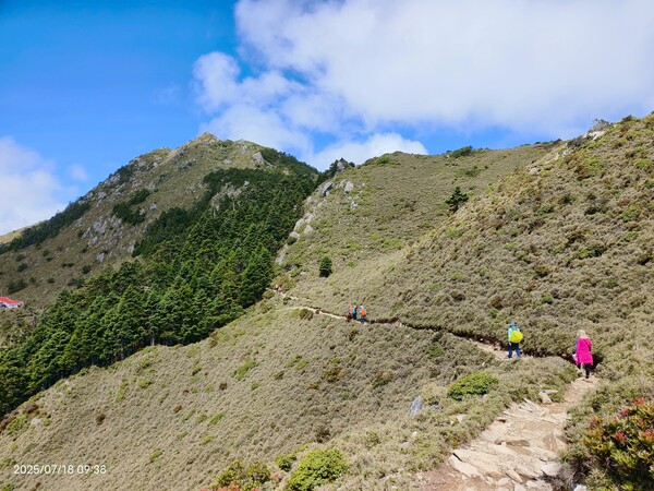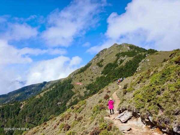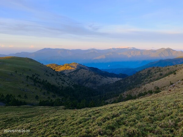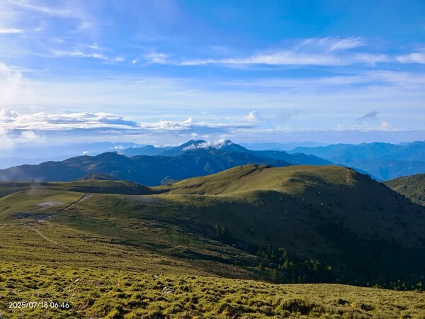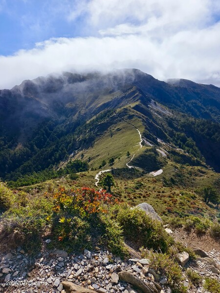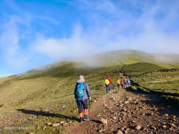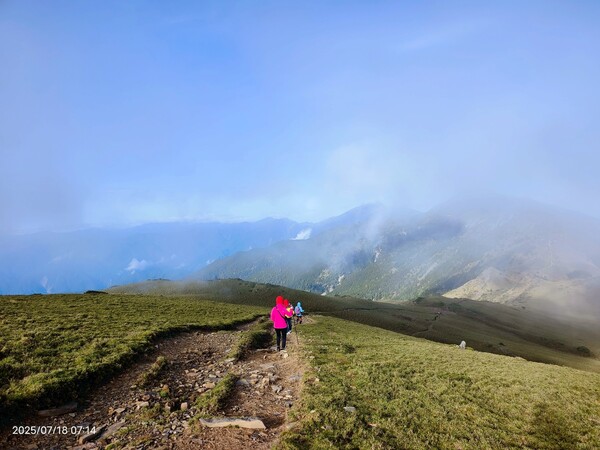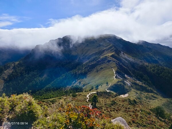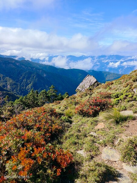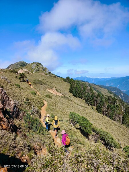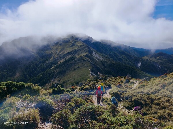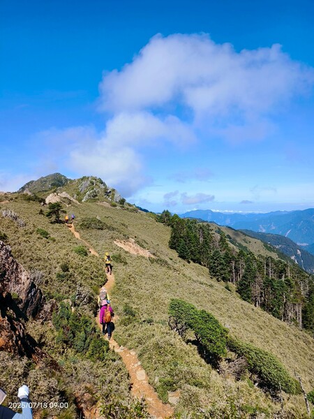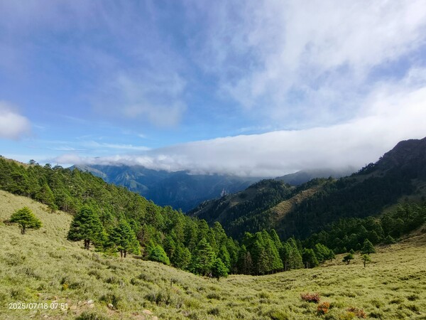不久,一路返回。自山屋來回嘉明湖約為10公里,一大早摸黑出門,回途方知景致如畫,我既爬坡小累又貪戀美景,於是小走小歇,安全無虞之下,藉休息片刻捕捉美景,感謝領隊與團員們並無催促,也感謝自己能在大家休息等待時間內補上,並未耽誤行程。