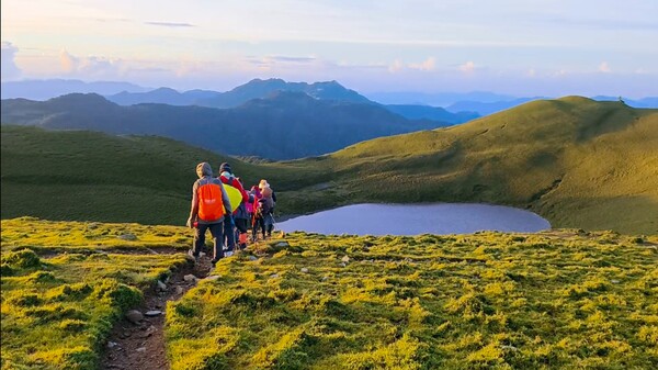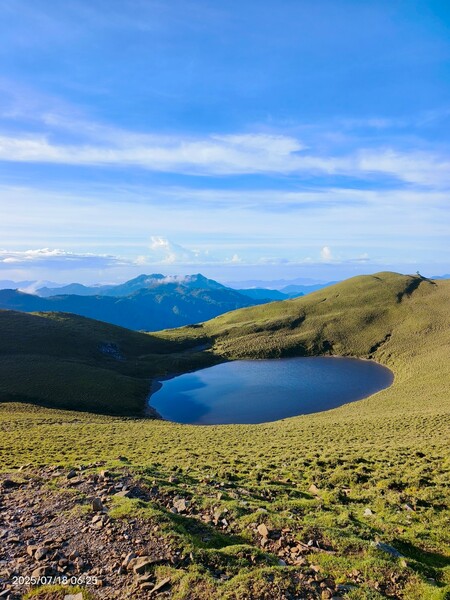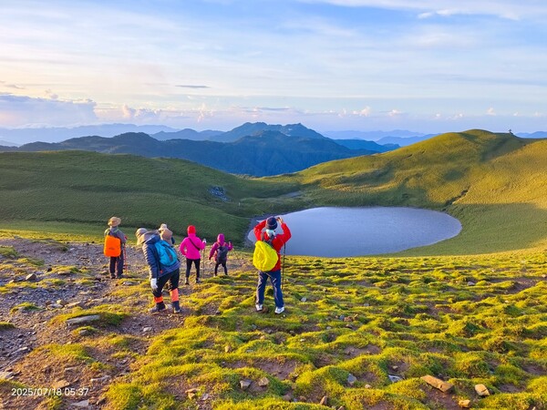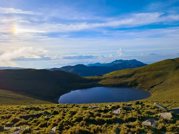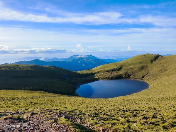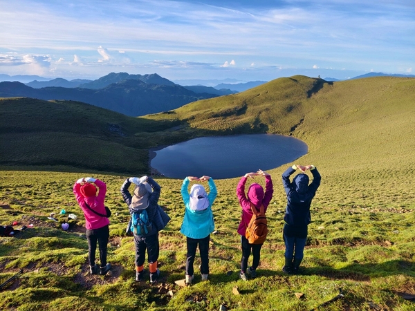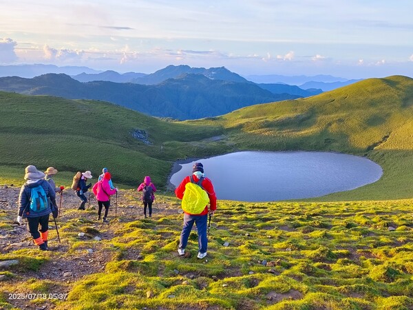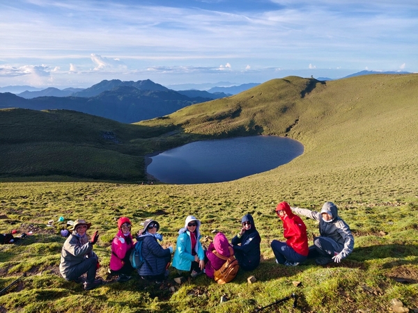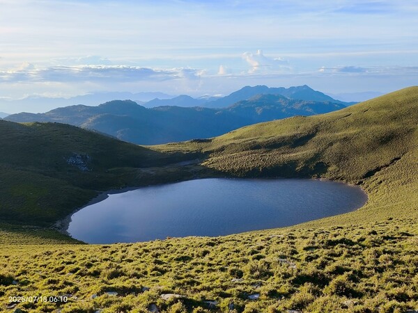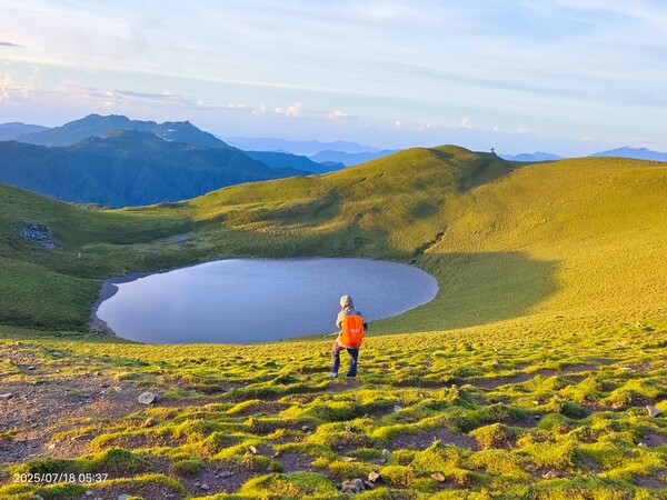 柔和晨曦,嘉明湖於碧綠箭竹草原上,宛如一滴「天使的眼淚」,在靜謐中等待山友一親芳澤;天色漸開,湖水因天光略為轉藍,體會到何謂「上帝遺落在人間的藍寶石」。湖面長約120公尺,寬約80公尺,沒有山澗或溪水流入,僅靠雨水挹注其中,卻常保終年不枯,此次幸運碰到滿水情況......我們在此停留一小時,依依不捨離開。