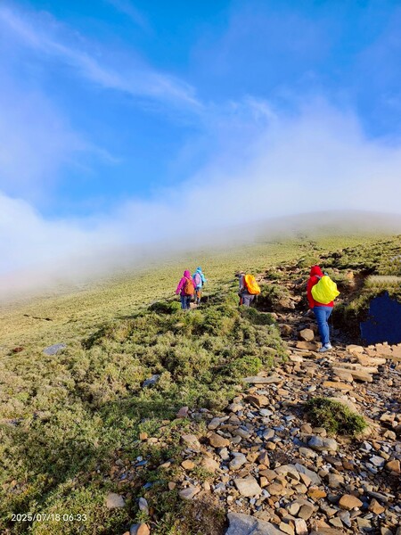 緊接著面臨第一個考驗:負重所有行李,由嘉明湖山屋經石塊陡坡上行,走出仿若遺世獨立的「秘境」,抵達7.4K雙叉路口才能下切到向陽山屋及向陽登山服務站。不久,開始微雨,最後2.7公里大雨,登山包雖有防水布,依然不敵雨勢!幾乎濕透了,狼狽至極!所幸已到停車場,每個人在車上另有備用衣物。難怪「寧可烈日焚身,也不要大雨滂沱」的登山名言不脛而走!
