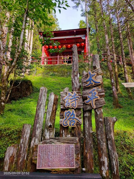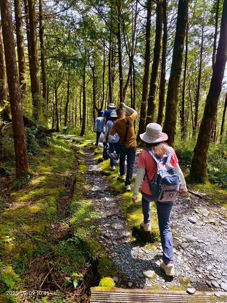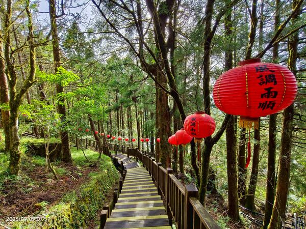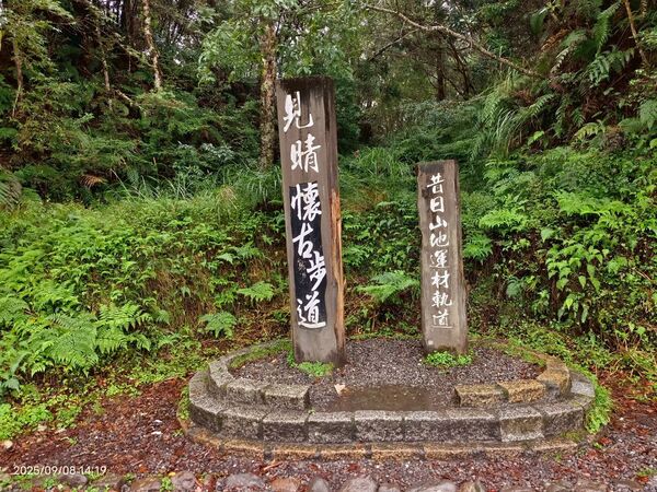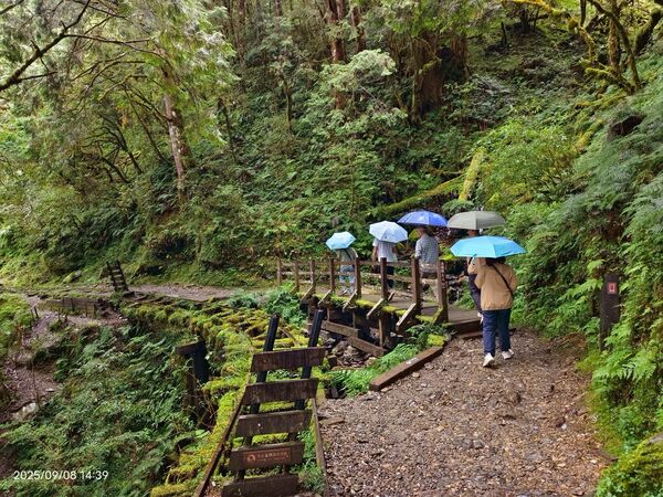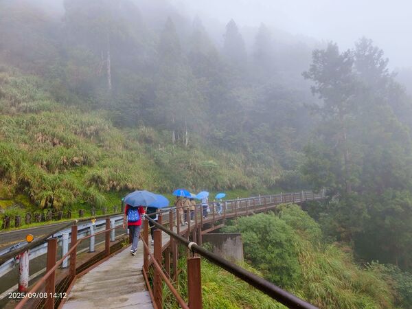 九月上旬,和先生童年好友三對夫妻檔驅車前往,午後車行至遊樂區售票口時,天空開始飄起細雨,眾人往目的地一路上行,雨勢卻愈來愈大。所幸抵達23.1K「見晴懷古步道」,只剩細雨菲菲,於是我們按原定計畫,打著傘在雨中漫遊。
