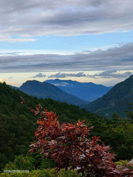 中央階梯兩側植滿「紫葉槭」,此為太平山莊特色。不同於秋天變色的楓紅,它於每年春天吐出新芽,長成深紫葉子,維持至10月間,秋冬時節逐漸落葉。紫葉槭在陽光穿透下,一片殷紅鮮明無比,孩子年幼時我初見此景甚是驚艷,當時正值七、八月份暑假,完全無法與秋冬紅葉聯想在一起。