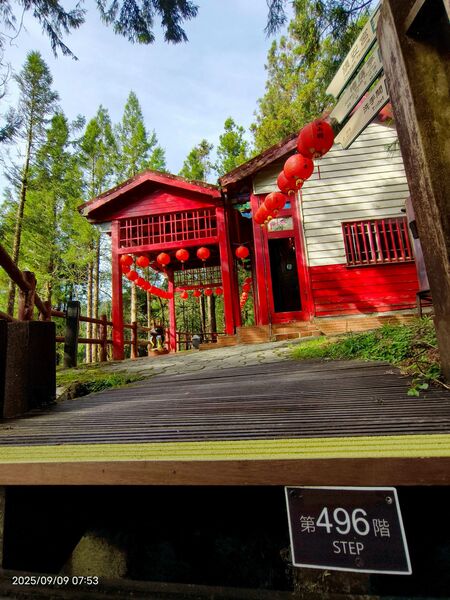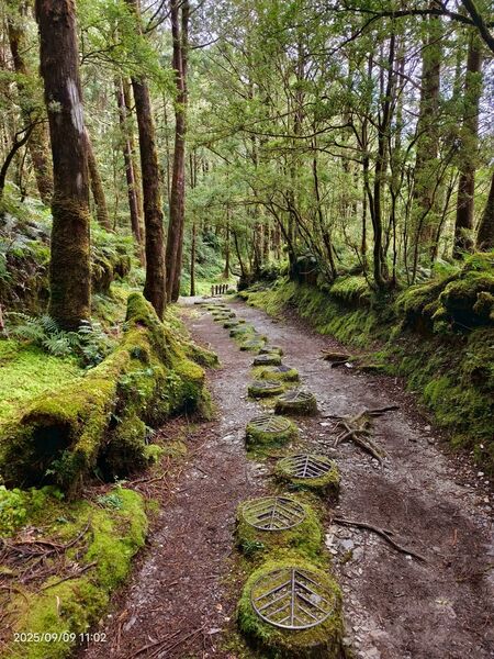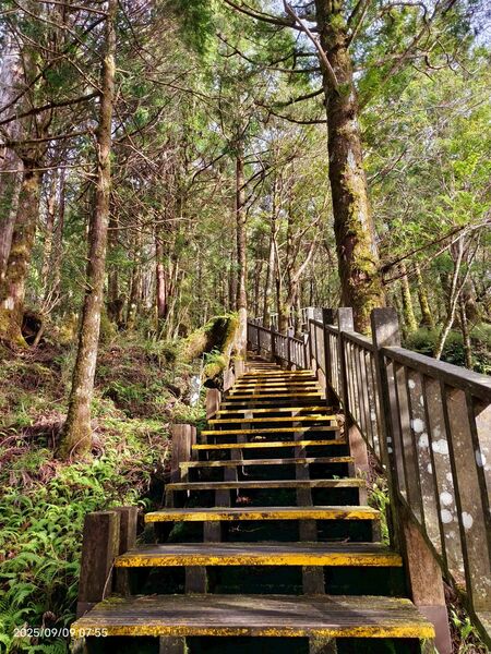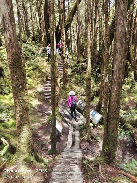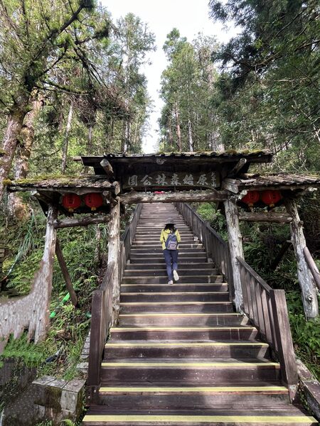 階梯盡頭為「檜木原始林步道」入口,平緩好走,係避暑森林浴最佳景點;緊接著,則是我心心念念的「鐵杉林自然步道」,沿途古木參天、蓊鬱蔽日,然而此次同行成員只有我勉強稱得上「健腳」,沒有人能陪我同行,於是我只好自己走上496階,在步道入口處拍照紀念,聊表思念。