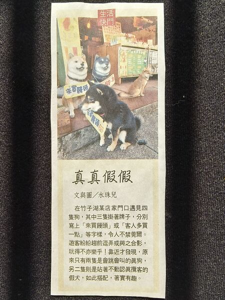 在竹子湖某店家門口遇見四隻狗,其中三隻脖子上都掛著牌子,分別寫上「來買饅頭」或「客人多買一點」等字樣,令人不禁莞爾。