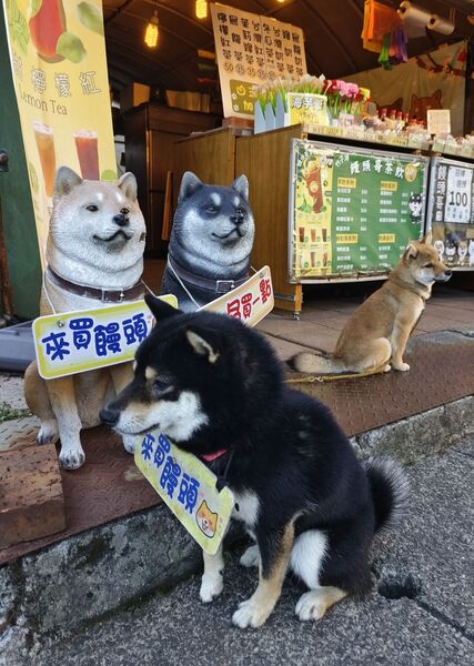 遊客紛紛趨前逗弄或留影,玩得不亦樂乎!靠近才發現,原來只有兩隻是會跳會叫的真狗,另二隻是站著不動認真攬客的假犬,如此搭配,著實有趣。