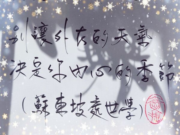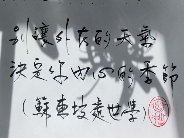 因緣際會正巧回顧了這一段學習書法的往事,「無意於佳 乃佳」~書法老師醍醐灌頂的聲音,以及女同學呈現生命狀態的書法,有如暮鼓晨鐘般,敲打在我心上!一如蘇東坡處世學~「別讓外在的天氣,決定你內心的季節。」加油、加油、加油!!