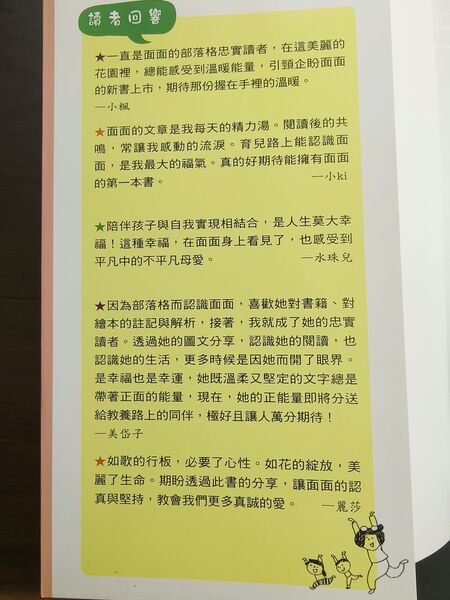 面面在忙碌教職、母職工作之外,仍能保有自我興趣、成就和空間,如今又多了親職作家的身分。她為生活所付出的努力、為生命所注入的熱情,躍然於新書、網誌或臉書,身為她的好友,至為感佩,一如我在書中讀者迴響所述:「陪伴孩子與自我實現相結合,是人生莫大幸福!這種幸福,在面面身上看見了,也感受到她平凡中的不平凡母愛。」