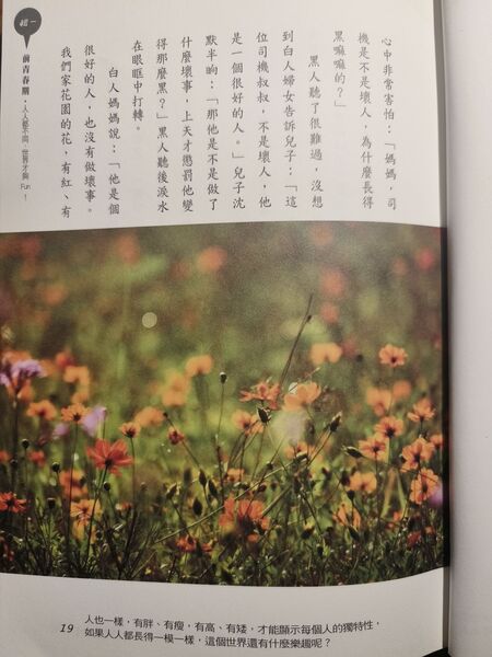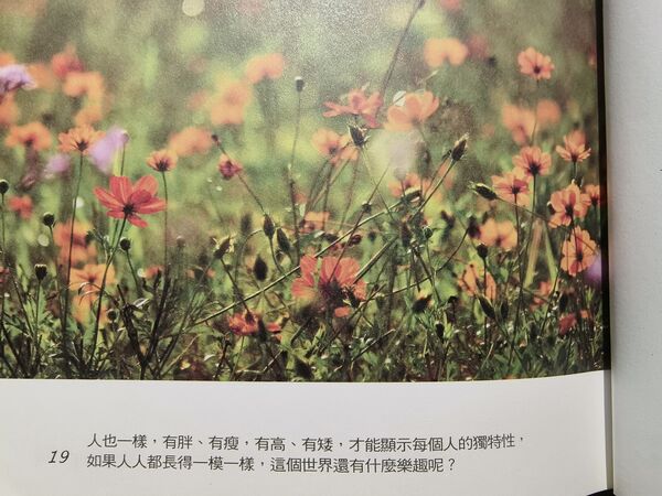 我想起一位白人婦女告訴孩子何謂黑人,教導孩子不要有分別心,因而溫暖了另一個傷痕累累之心的故事,於是我回答么兒:「就像花朵有紅黃白紫很多顏色,才顯得五彩繽紛;人也一樣,有胖、有瘦,有高、有矮,才能顯示每個人的獨特性,如果人人都長得一模一樣,這個世界還有什麼樂趣呢?」