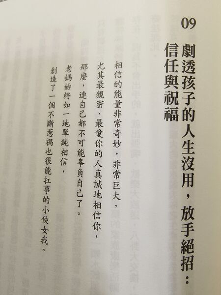 🌱展讀此書很多感想,有一段情節,光看到09那一頁標題與綱要,就讓我哭到無法自抑。 這份感動是看見一位媽媽的放手、信任與祝福,成就了自認不斷惹禍也很能扛事的作者;同時觸動了自己在教養路上的昔日點滴,內心更加篤定要「單純地相信」已成年的三個孩子,給予他們最大的信任和祝福。