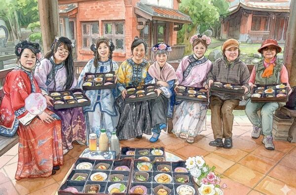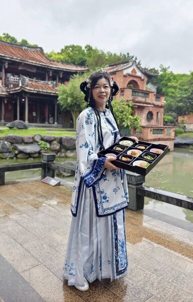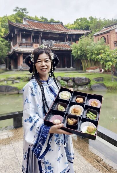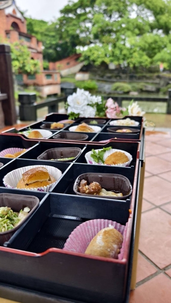 近午時分,福華大飯店主廚顧問 王永宗 監製的午餐,由復刻古早味酒家菜的「宗舖師 」親自送到古厝大門口,與格格們合影留念。在「映月大池」醉茶居中,打開九宮格餐盒,雅致特別已令人讚嘆,細細品嚐,更教人驚喜連連,美好的春日雅宴。