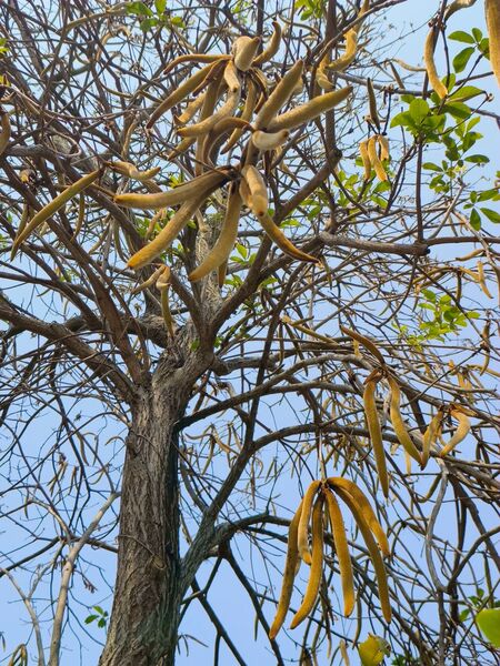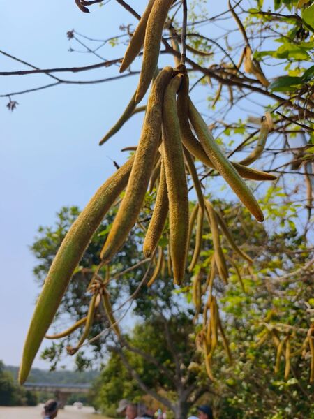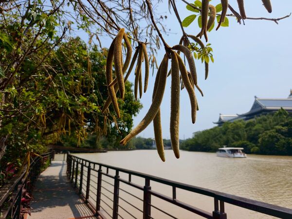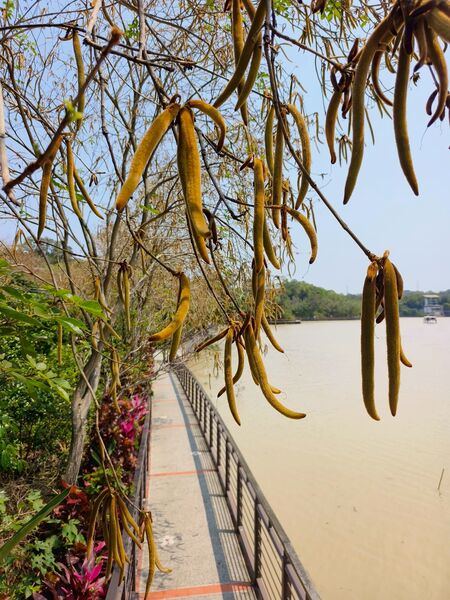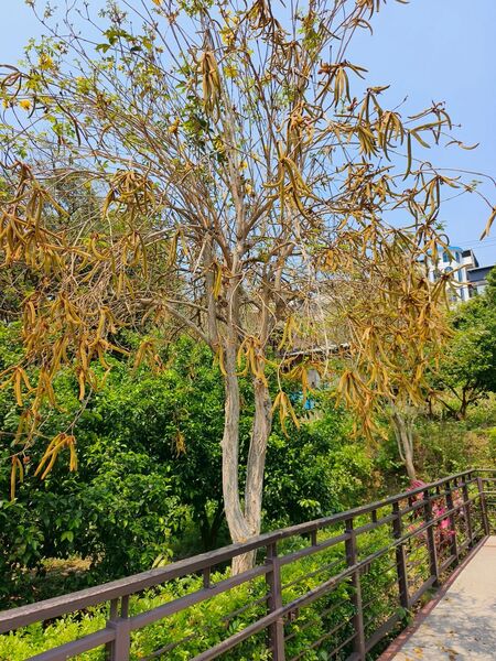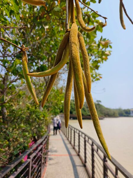喜出望外的是,之前卯盡全力綻放的黃花風鈴木,此時已結實纍纍,褐色長型果莢掛滿枝頭,教人驚喜連連啊!