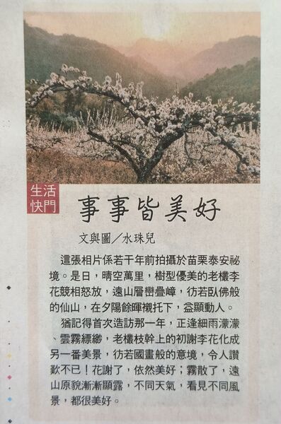 這張相片係若干年前拍攝於苗栗泰安祕境。是日,晴空萬里,樹型優美的老欉李花競相怒放,遠山層巒疊嶂,彷若臥佛般的仙山,在夕陽餘暉襯托下,益顯動人。 猶記得首次造訪那一年,正逢細雨濛濛...