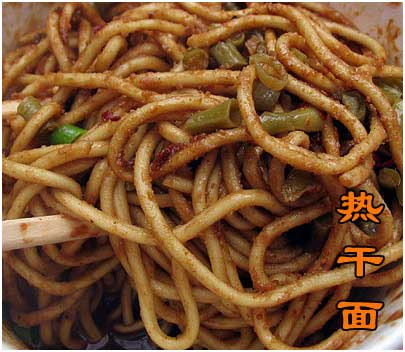 熱干麵既不同於涼麵,又不同於湯麵,面條事先煮熟,拌油攤晾,吃時再放在沸水裏燙熱,加上調料,成品面道筋道,黃而油潤,香而鮮美,誘人食欲。