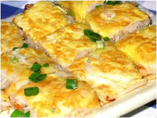 這個是"三鮮豆皮",三鮮豆皮是湖北人“過早”的另一種主要食品,也是湖北民間的一種傳統小吃。以前人們逢年過節時用綠豆、大米混合磨漿攤皮,包上糯米、肉丁,油煎後作為節日佳肴;後來成為尋常早點。