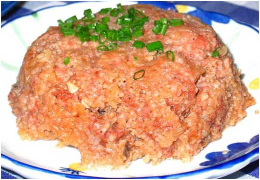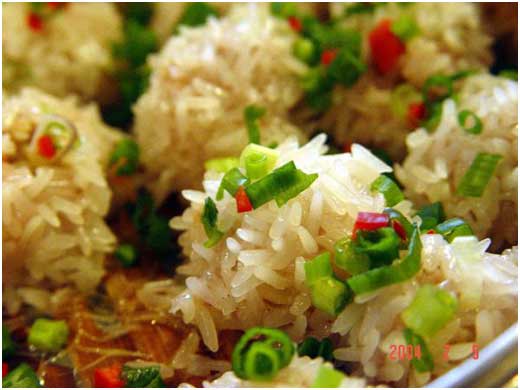 珍珠肉丸,裏面以肉為餡,外面裹上糯米,蒸熟即可,再撒上蔥花,即好看由好吃。