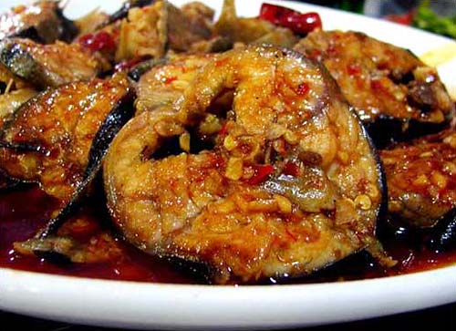 鍋內留底油,下蒜瓣、姜絲煸炒出香,投入幹辣椒段、花椒、迅速加入糖兩勺、老抽數滴、少許醋翻炒幾下加少許水(要少,水多魚塊無法保持焦脆口感,寧可先少放,再分次點一次水以保證麻辣的味道能附到魚上),倒入魚塊,迅速翻炒均勻撒芝麻、蔥花起鍋。