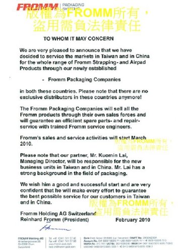 Fromm瑞士官方網站之台灣分公司介紹與聯絡網址