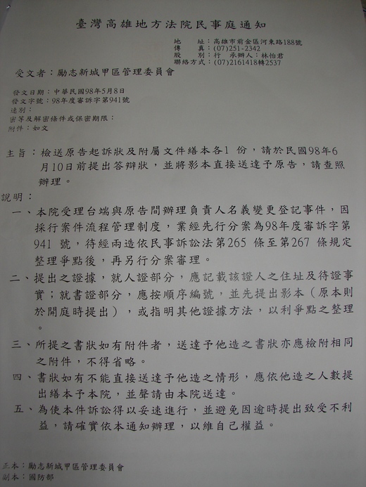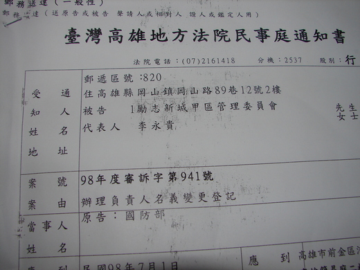 但是所有社區的住戶不要緊張,國防部承辦人身為公職人員,卻處處不依據政府法令行事(公寓大廈管理條例第28條及57條),現遭受高雄縣政府罰款,卻意圖怪罪管委會,大家思考一下,若此事為管委會違法,為何高雄縣政府罰款的對象不是管委會?且國防部違反57條的規定,高雄縣政府罰單近日亦將送到!身為退役榮民的我,對於現在這些承辦人員的所為,實在無法想像,軍校教育的國家、責任、榮譽到底跑到哪裡去了?
