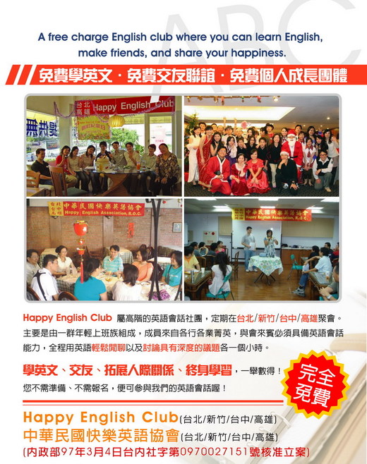 Happy English Club 是一個免費學習英文的政府立案社團,每週六下午固定聚會,歡迎參加!