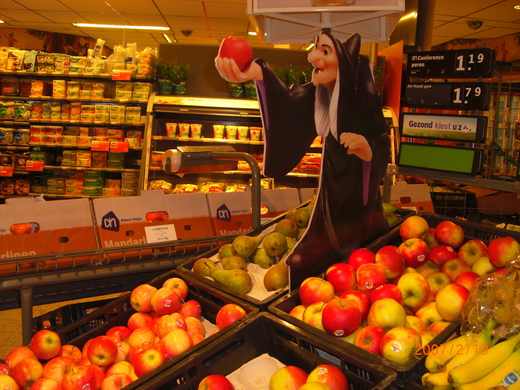 整個超市出沒著白雪公主和七矮人,除了水果區的巫婆,也有毛茸茸的玩偶可以選購。我很喜歡巫婆兜售蘋果的創意,站著那欣賞了許久,雖然不知道這會壓抑還是刺激消費,還是非常欽佩荷蘭人把超市變得如此有趣!