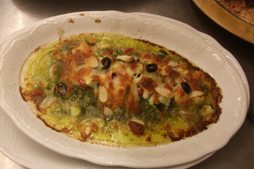剛才做好的青醬取出適量,加入鹽,10 CC鮮奶油,調勻,舖在比目魚肉上,再酒上番茄丁,節瓜丁 (或用小黃瓜代替),最後酒上磨成碎絲的莫札瑞拉起司,.松子/杏仁片,黑橄欖,裝飾.
