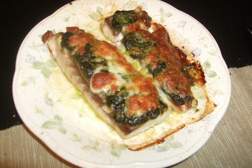 暑魚片解凍後先酒點鹽,把青醬舖在上面,再舖起司,沒弄番茄黃瓜,陽春烤魚湊合著做.放進已預熱好的烤箱,烤 20分完成.