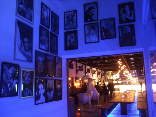 用電腦放大後做成牆壁裝飾,還貼了許多電影明星照片.以牡丹花圖案做主調來佈置偌大無樑柱的廠房餐廳.