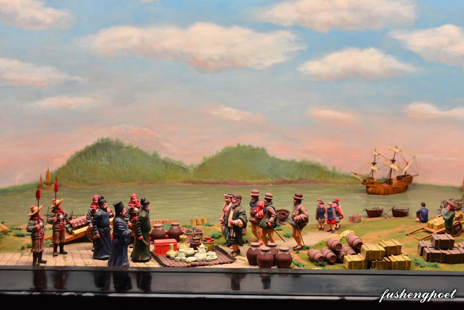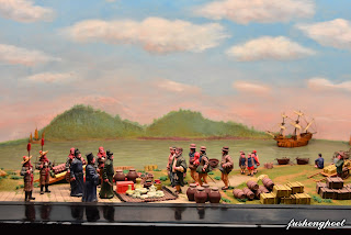 | 葡萄牙人初上岸的示意模型。葡萄牙人在1553年至1557年間常以海難為藉口獲准在澳門上岸,曬乾被海水浸溼的貨品。 | |