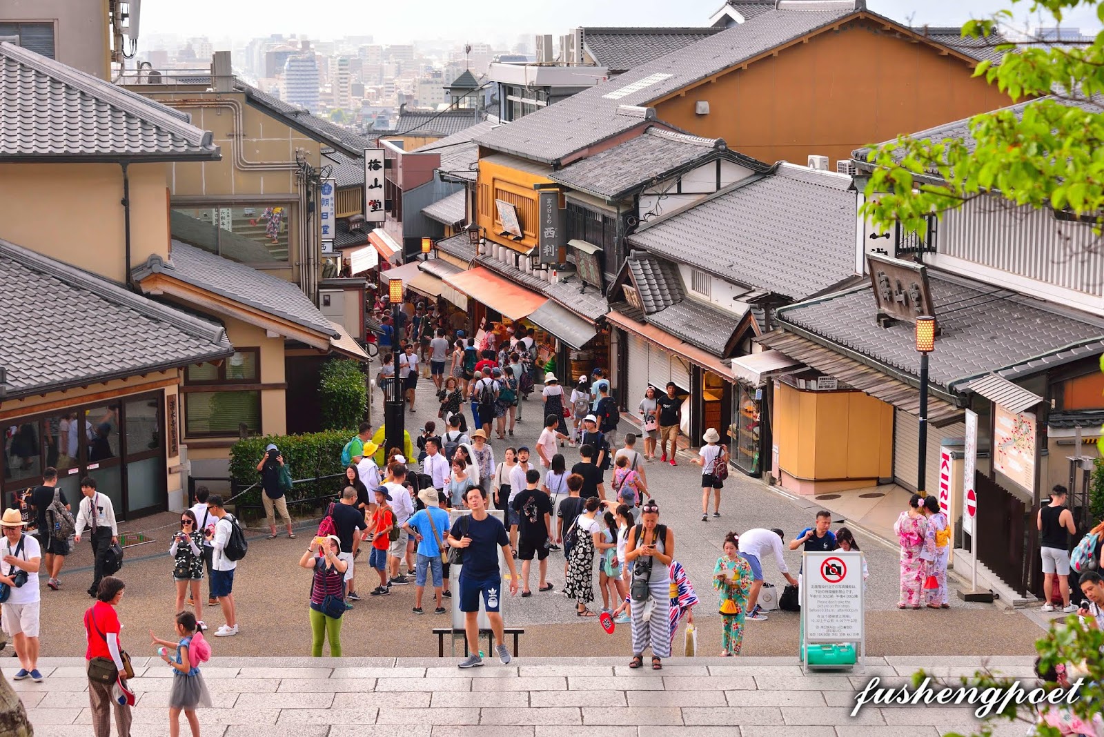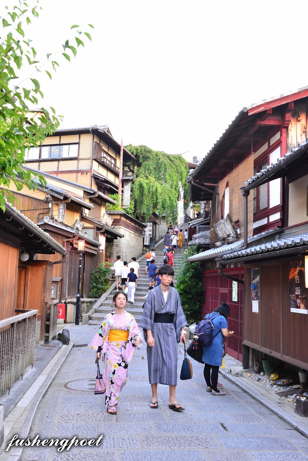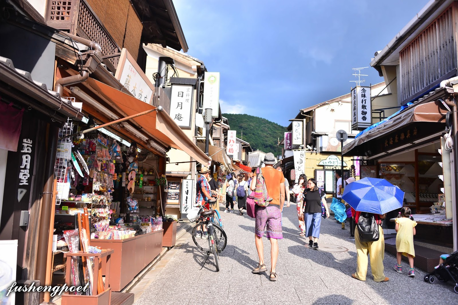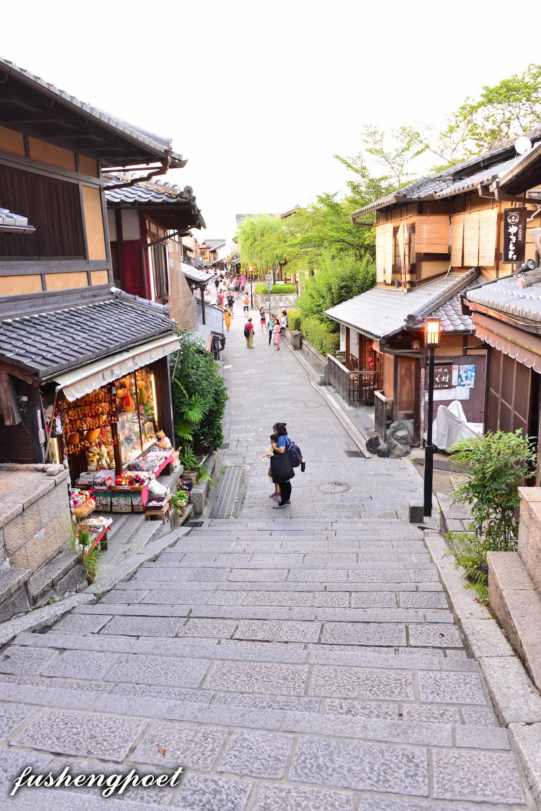 | 由「松原通(清水道、清水坂)」走了一段下坡路,可由原路向右切向三年坂(產寧坂、三年坡[在日本坂就是坡]),這是一條階梯甚多的小路。三年坂開闢於日本大同3年(西元808年),故以年為名。傳說在三年坂跌倒則在三年內不治或折壽三年,不管信不信,都要小心避免在陡峭的下坡路跌倒,尤其是邊走邊滑手機的人,否則當下可能就有嚴重意外。 | |