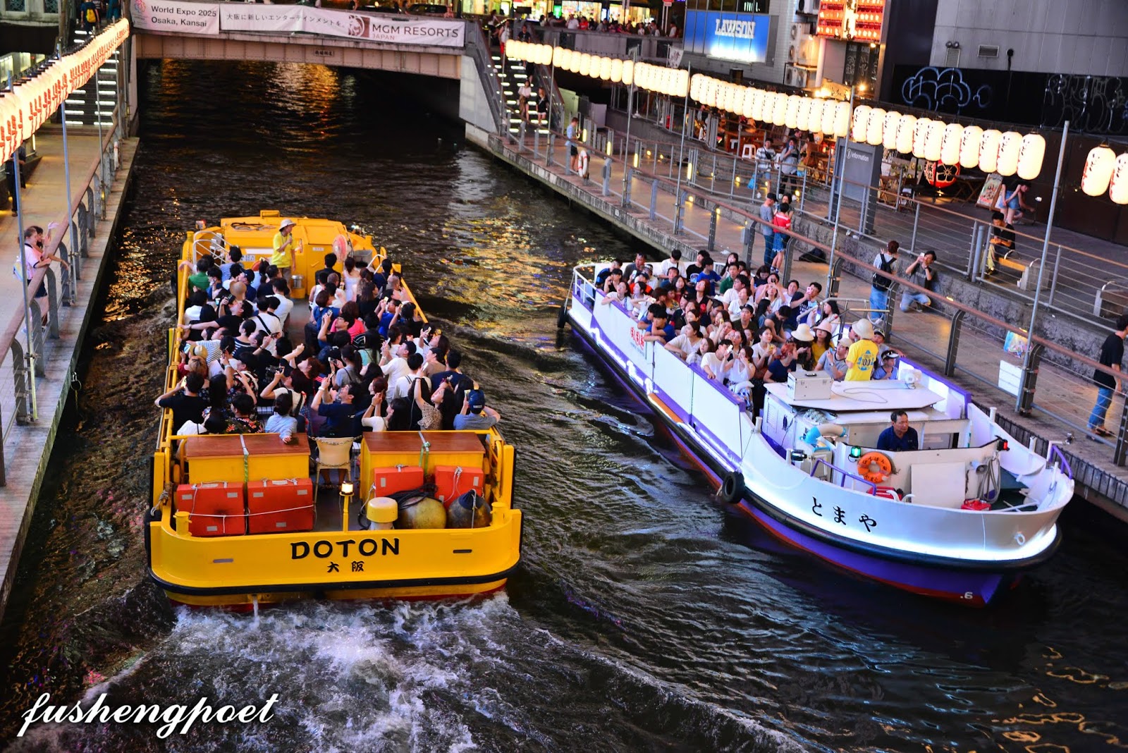 | 戎橋下恰逢兩艘遊船交會在道頓堀河上。 | |