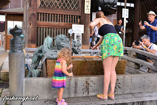 | 普門閣前的淨手、淨口台。先以右手持杓舀水洗左手,再以左手持杓舀水洗右手,後以右手持杓舀水倒在左手,並以左手的水漱口。 | |