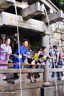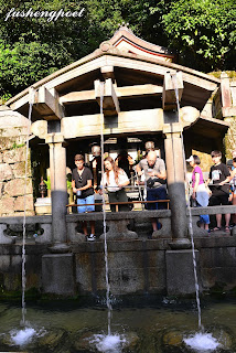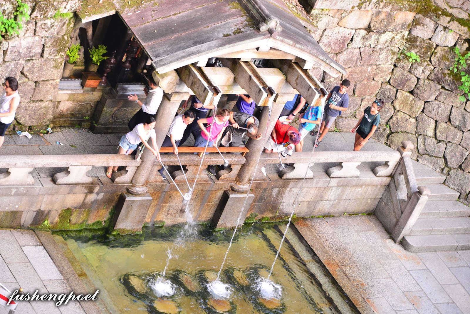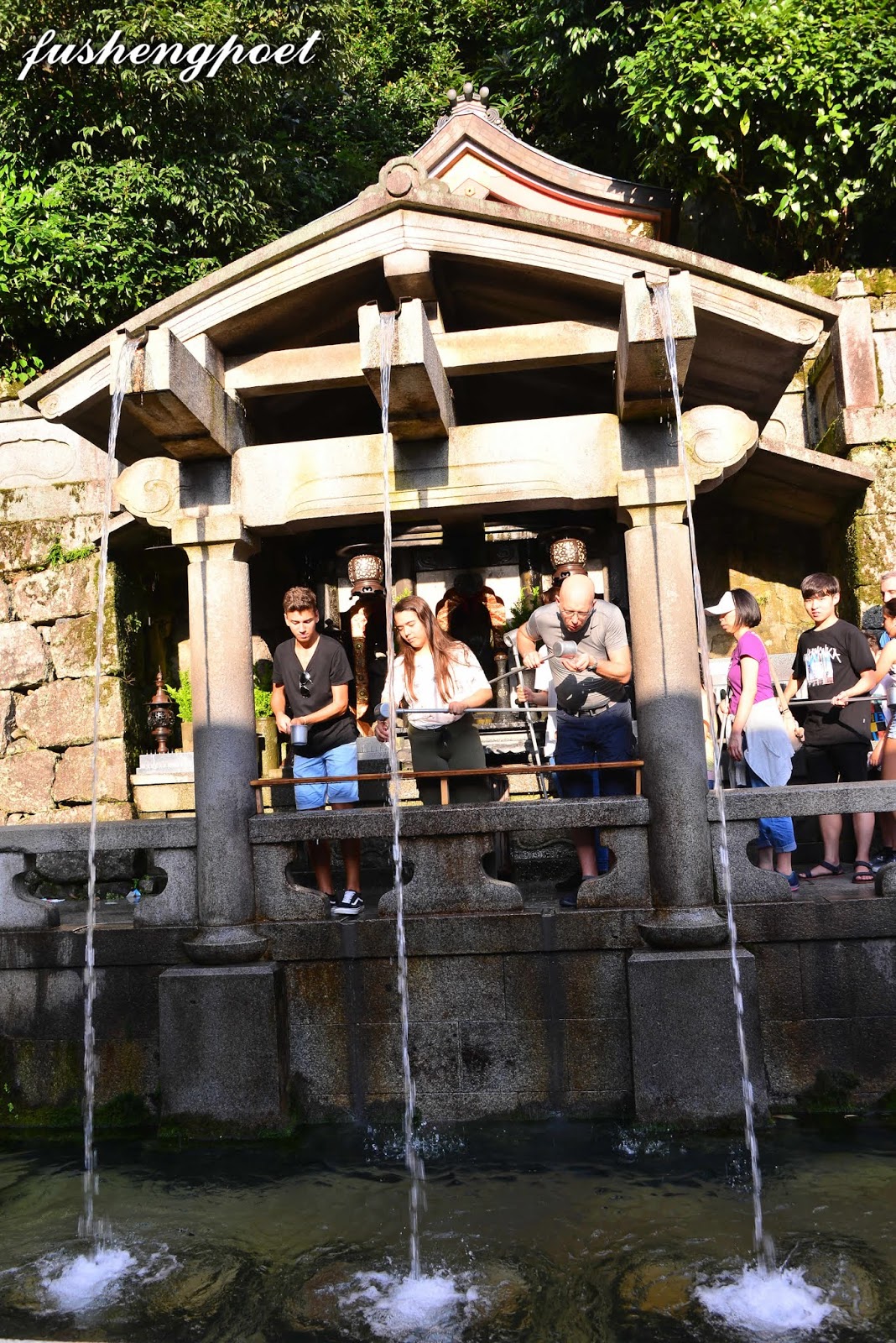 | 音羽瀑布為終年不絕的山泉,被列為日本十大名泉,在此分為三道小瀑流,由左至右分別代表學問成就、戀愛成就、長壽成就,據說只要在三道瀑流擇一喝上一口,象徵那一道瀑流的願望就會實現,喝了多道瀑流或一道瀑流喝了多口就不靈了。 | |