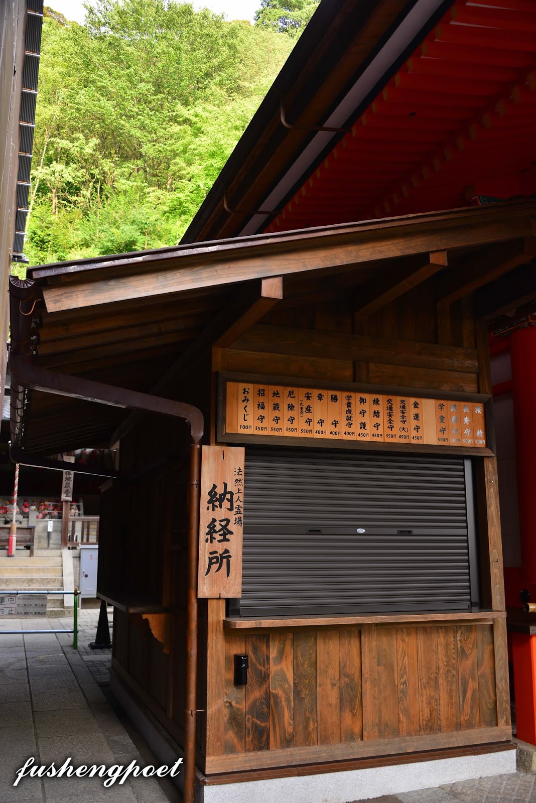 | 阿彌陀堂旁的納經所。納經是讀經、寫經祈福後,在納經帳上蓋上朱印,再用毛筆寫下這座寺供奉的本尊與寺名,每次納經會收取一定的費用,納完經還會給一張印有該寺本尊圖像御影。 | |