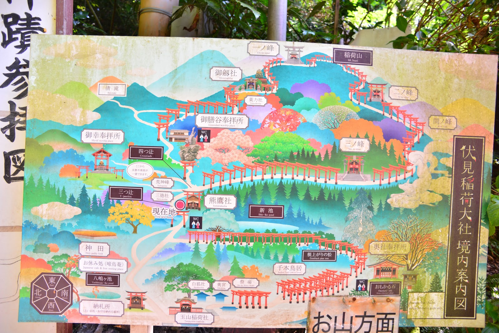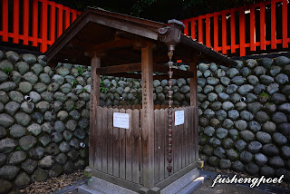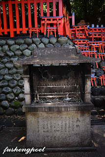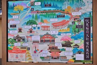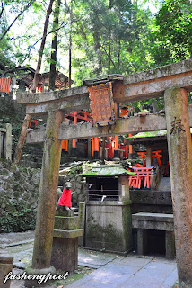 | 伏見稻荷大社圖(包含熊鷹社以上)。從伏見稻荷大社前的大鳥居入口走到這裡(熊鷹社),大約耗時一個小時,雖然我沒有刻意記下遊覽時間,但是事後憑藉自己在大鳥居入口拍攝相片記錄的時間以及這張相片記錄的時間而得到精準的答案。按照原有的計畫要從此(熊鷹社)地返回,不過不是原路折回,而是繼續往另一個方向向下坡繞回來,這條下坡路可以經過許多形形色色、不同專長的小神社。 | |